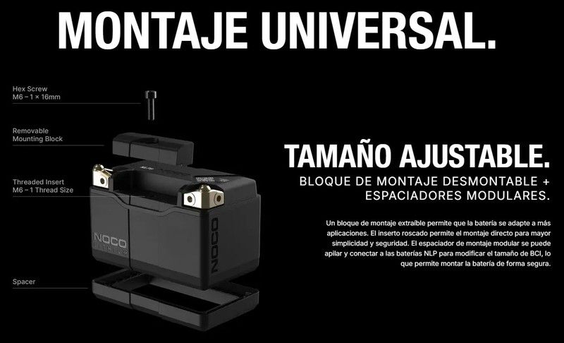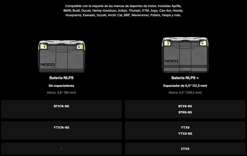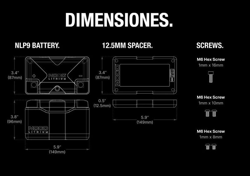 Batería de litio para deportes de motor NOCO Lithium NLP9 de 12 V, una batería del grupo 9 con una potencia nominal de 3 Ah (38 Wh) y 400 amperios de potencia de arranque. Es mejor que las baterías de plomo-ácido para motocicletas en casi todos los aspectos: no se sulfatan, no se activan, no requieren ácido, no requieren mantenimiento, no necesitan agua y se entrega completamente cargada y lista para instalar. La serie de baterías de litio para deportes motorizados más avanzada y diseñada hasta el momento. Ofrece más de 400 amperios de potencia de arranque, más de 50 000 arranques y más de 2000 ciclos de carga, superando a sus rivales de plomo-ácido. Utilice el modo de litio de cualquier cargador GENIUS para recargar por completo una batería NLP en minutos. Con la tecnología de carga rápida más avanzada, proporciona suficiente potencia de arranque con solo 5 minutos de carga. Equipado con un sistema de gestión de batería avanzado y de activación automática que brinda máxima protección, rendimiento y ecualización de celdas bidireccional para una estabilidad duradera. No es necesario restablecer el BMS. Diseñado con una base de amortiguación de goma personalizada e inserciones de espuma para extender la vida útil de la batería y mantener las conexiones seguras. Los terminales NLP se pueden montar desde el frente, el costado o la parte superior, y se pueden quitar por completo según la aplicación. Use el tornillo hexagonal provisto para montar el terminal. Un bloque de montaje extraíble permite que la batería se adapte a más aplicaciones. El inserto roscado permite el montaje directo para mayor simplicidad y seguridad. El espaciador de montaje modular se puede apilar y conectar a las baterías NLP para modificar el tamaño de BCI, lo que permite montar la batería de forma segura. Compatible con la mayoría de las marcas de deportes de motor, incluidas Aprilla, BMW, Buell, Ducati, Harley-Davidson, Indian, Triumph, KTM, Argo, Can-Am, Honda, Husqvarna, Kawaski, Suzuki, Arctic Cat, BRP, Waverunner, Polaris, Vespa y más.