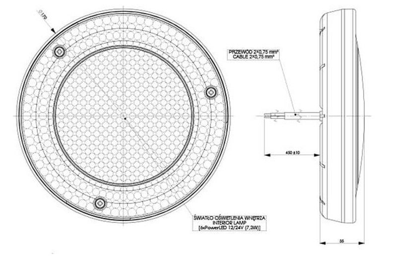 12-24V. De 6 leds. Flujo luminoso de 690 lúmenes. Temperatura del color de 4000 kilogramos. Con cable de 2x0,75mm2 y longitud de 0,45m